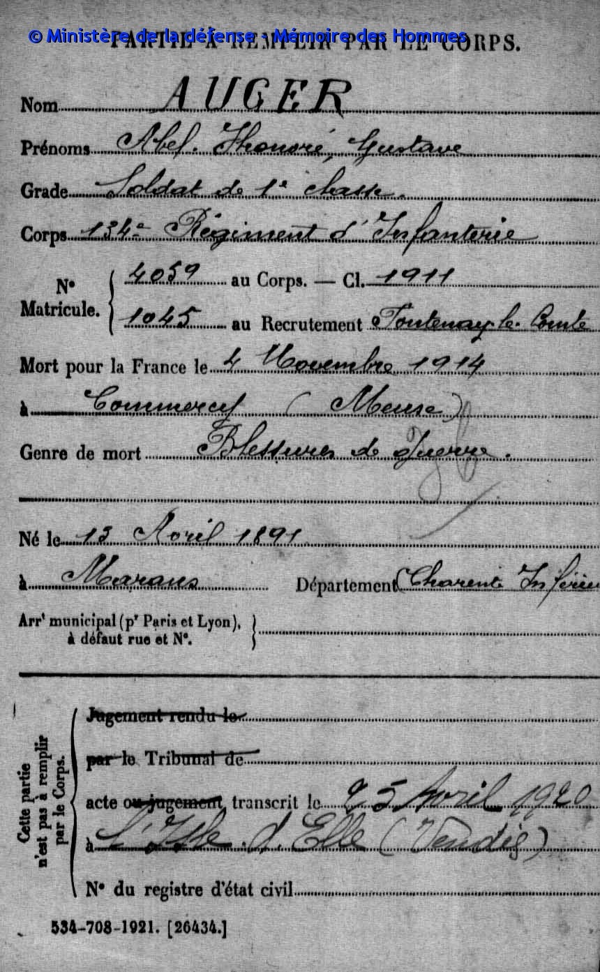 Acte de décès retranscrit à Coulonges en 1915 et également commune de l’île d’elle ( 85 ) le 25 avril 1920.
