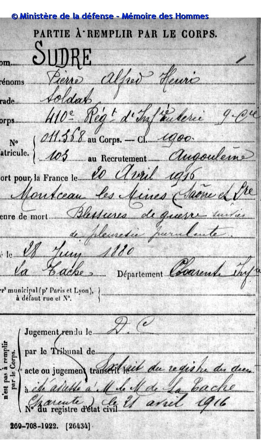 Mort pour la France à Montceau les mines le 20 avril 1916, ( hôpital militaire ).