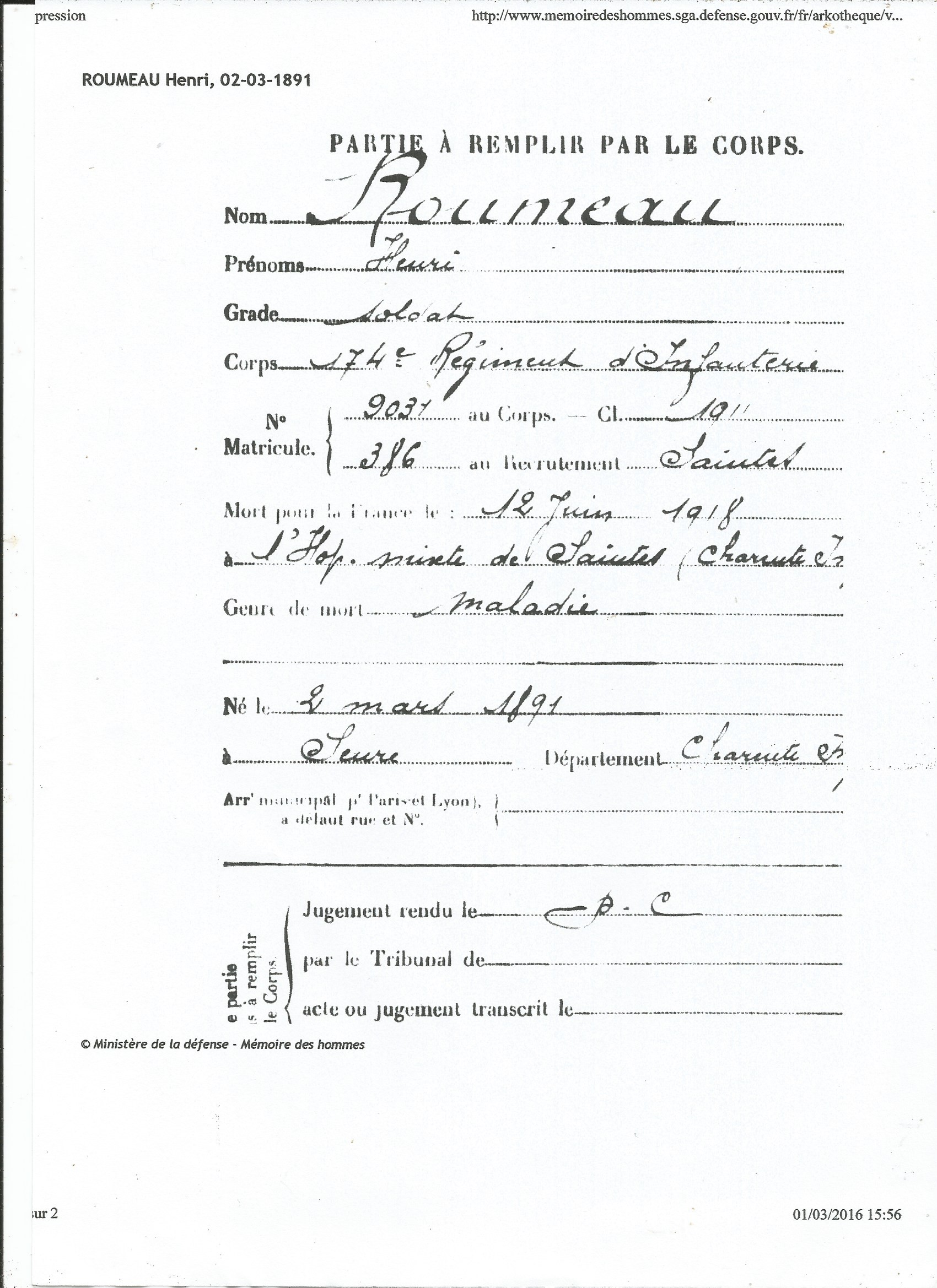 Je vais donc considérer que Henri Roumeau comme les 4 soldats dont j’ai parlé précédemment a le droit d’être aussi sorti de l’oubli. Ce dernier comme les autres n’a pas son nom mentionné sur le monument de sa commune de naissance.