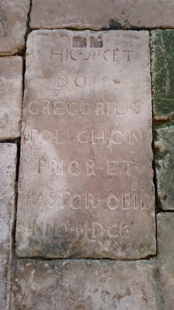 Ci gît maître Grégoire Rolichon, prieur et prêtre mort en l’an 1700. Après l’inscription MDCC l’on distingue d’autres lettres. Grégoire Rolichon est mort en fait le 2 février 1771.