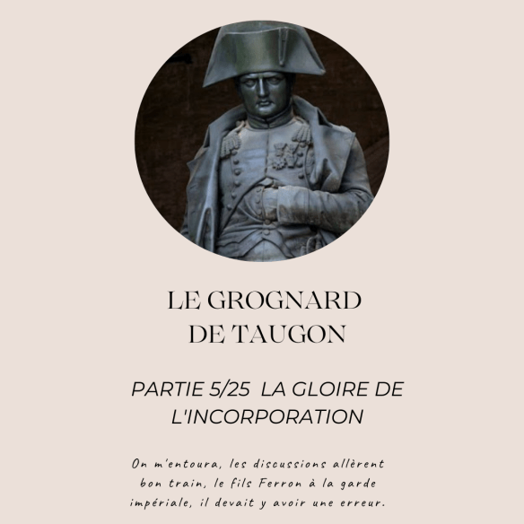 On m’entoura, les discussions allèrent bon train, le fils Ferron à la garde impériale, il devait y avoir une erreur. Mais non il n’y en avait pas, 2ème régiment de tirailleurs chasseurs de la jeune garde.