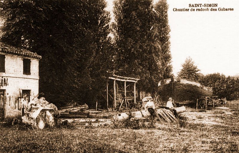 Les gabares que Jean saluait en levant sa canne était le moteur économique de la région, chargées de vin, de bois, elles descendaient aidées par le courant jusqu’à Rochefort et Tonnay Charente. Celles construites à Saint Simon l’étaient à franc bord puis calfatées, elles pouvaient porter gréement. Souvent halées, soient par des animaux soient par des hommes ( souvent des femmes à Saint Simon ), elles remontaient le courant chargées du sel, venu des marais salant des environs de Rochefort.
